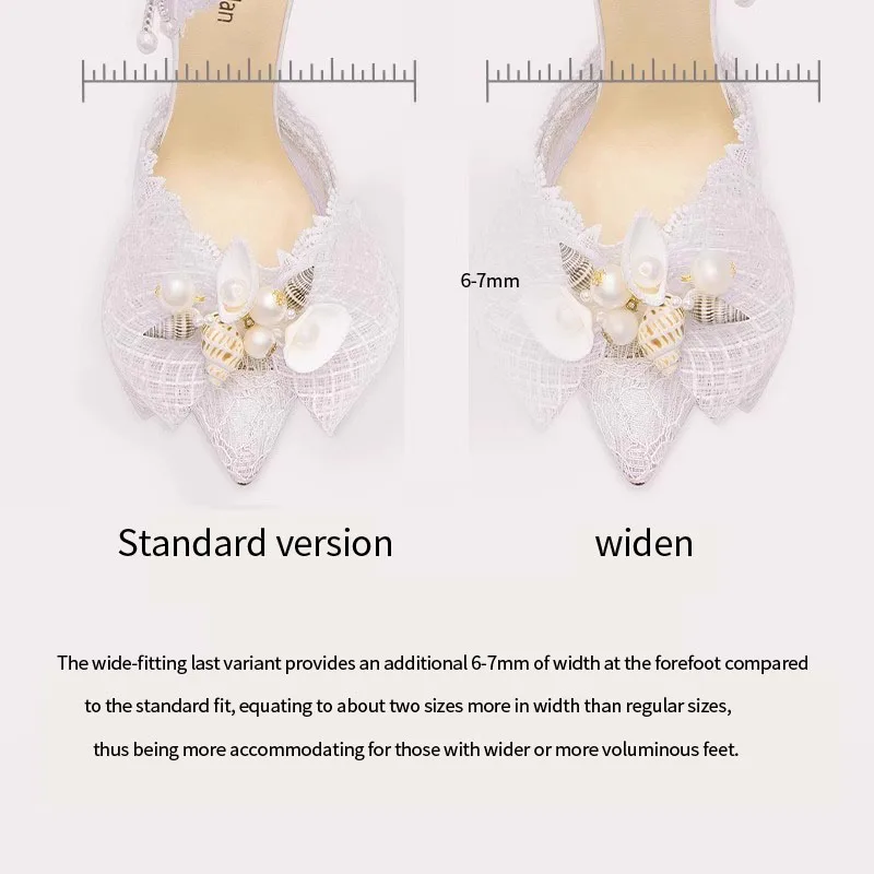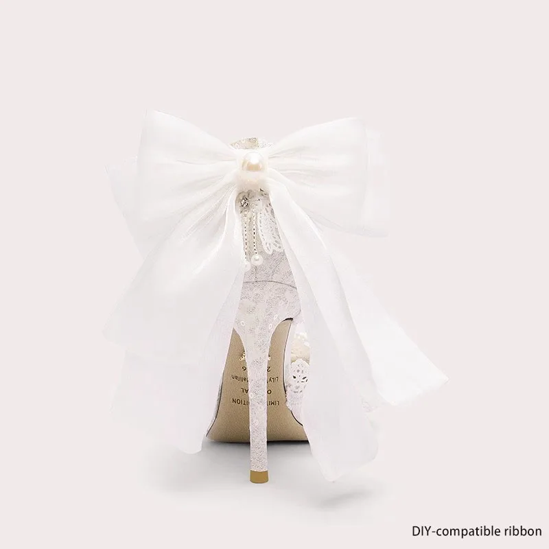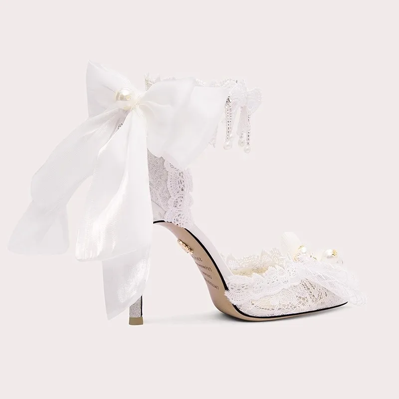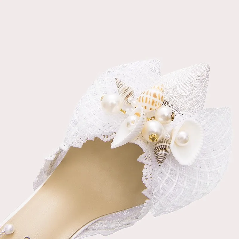 Charming Bridal High Heels with Lace Ankle Strap Large Bowknot Pearl Shell Ornament Elegant Wedding Shoes for Brides